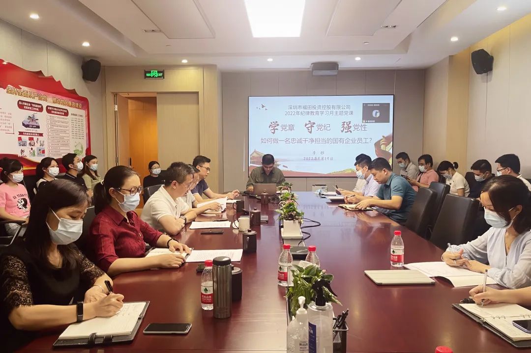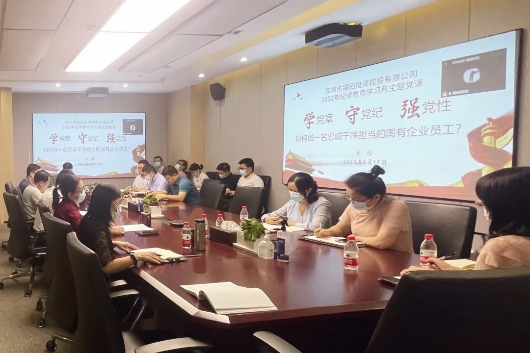 9月19日下午,深圳市福田投资控股有限公司开展2022年纪律教育学习月“学党章、守党纪、强党性”主题党课。党课以“线上+线下”的方式进行。公司各部门、辖属企业全体员工参会。